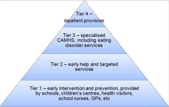 Tier 1 means early intervention and prevention and is provided through schools and children’s centres, health visitors, school nurses, GPs, Youth Connexions, helplines and websites for support with external factors affecting wellbeing; with general emotional wellbeing; and for online therapeutic support and self-help.